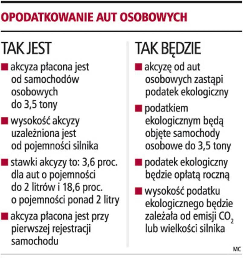 Akcyzę nakładaną na samochody osobowe zastąpi podatek ekologiczny. Z założeń przygotowanych przez Ministerstwo Finansów wynika, że będzie to podatek pobierany co roku. Jego wysokość będzie zależała albo od emisji CO2, albo od pojemności silnika. Jego wysokość nie powinna rocznie przekraczać kilkuset złotych. Zarówno branża, jak i niezależni eksperci popierają koncepcję podatku ekologicznego, choć zastrzegają, że diabeł tkwi w szczegółach i z ostateczną oceną należy wstrzymać się do momentu przedstawienia projektu.