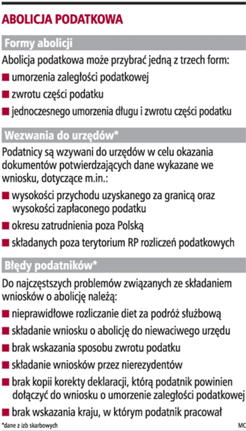 – Najczęstszymi błędami występującymi we wnioskach abolicyjnych są np. przyjmowanie do rozliczenia przychodów netto zamiast brutto; brak wskazania kraju, w którym uzyskiwano dochody; błędne adresy zamieszkania; brak podpisów; nieprawidłowo zastosowany kurs waluty – podaje Krystyna Arciszewska z Izby Skarbowej w Olsztynie.