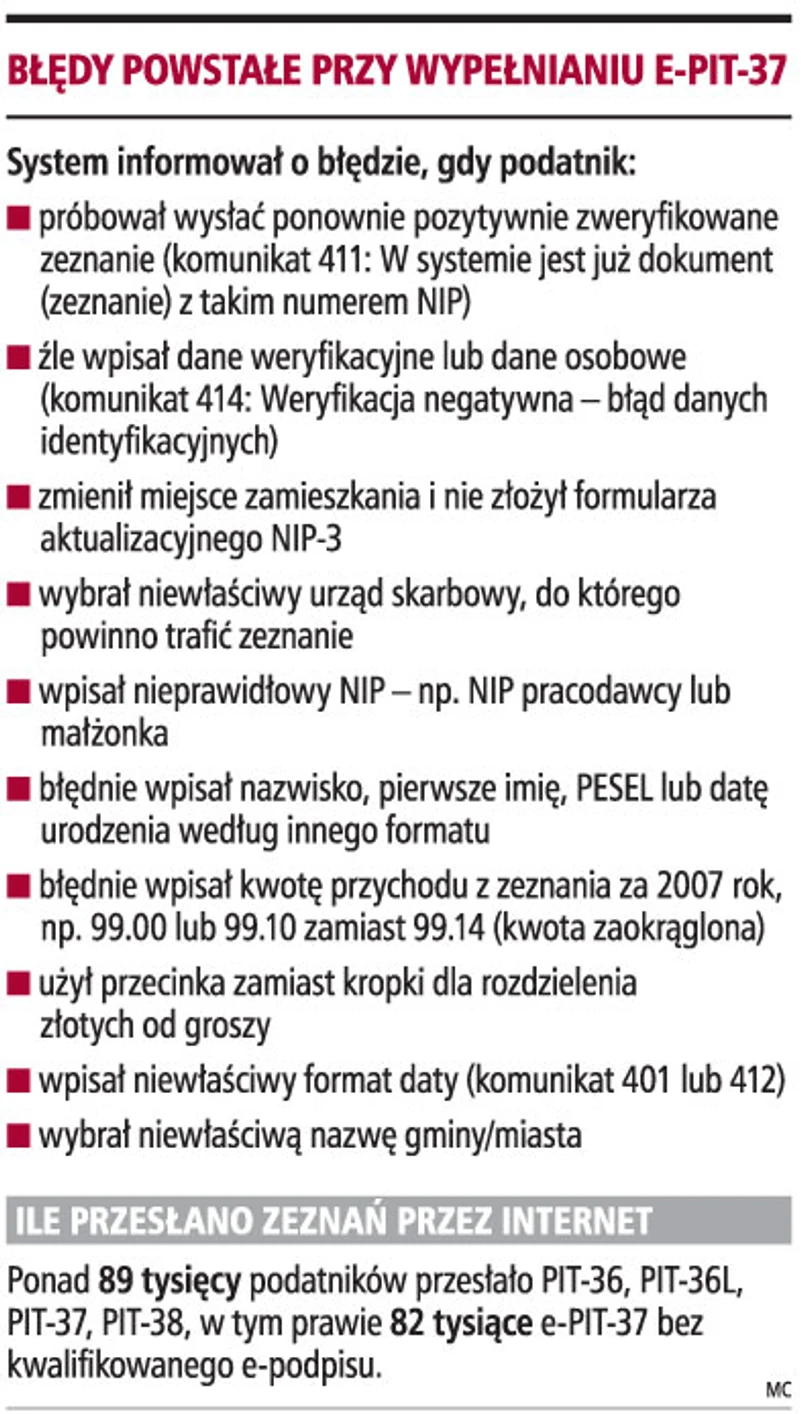 Przyczyny błędów mogły być bardzo różne: od literówki po błędy rachunkowe i niewłaściwą kwotę przychodu za 2007 rok, która była jedną z danych weryfikacyjnych niezbędnych do podpisania e-PIT-37.