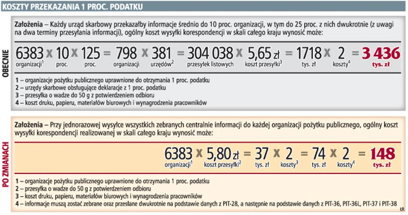 Z projektu MF wynika, że liczba przesyłek z informacjami, kierowanymi do organizacji może sięgnąć w niektórych urzędach skarbowych nawet kilku tysięcy sztuk – w zależności od liczby osób wyrażających zgodę na przekazanie swoich danych osobowych lub umieszczających informację o celu szczegółowym 1 proc.