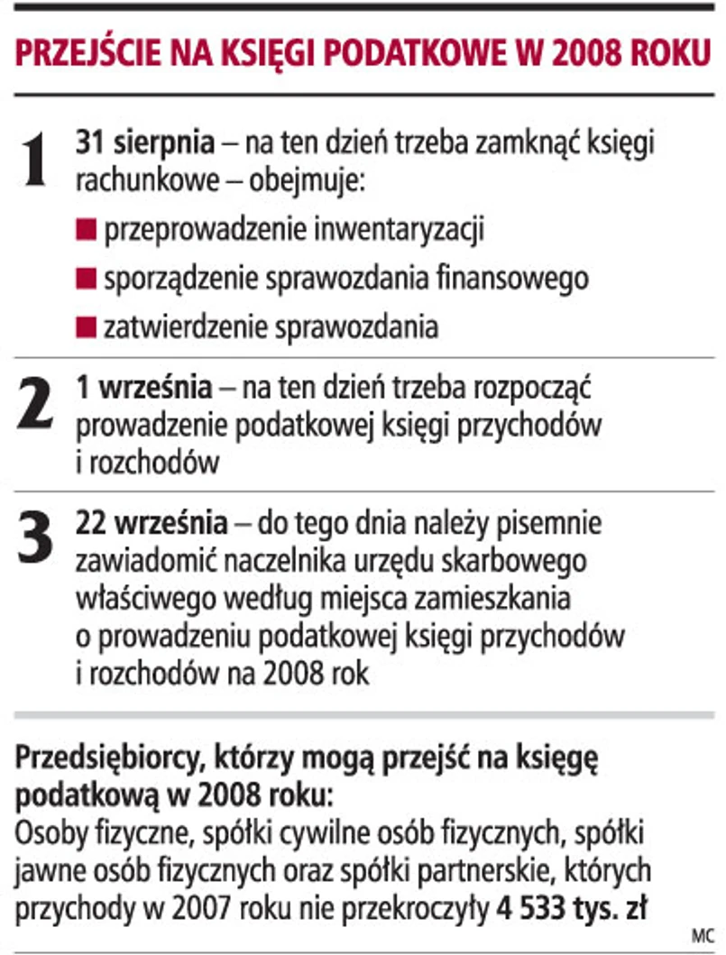 Firmy, które zdecydują się na ten krok, muszą zamknąć księgi na 31 sierpnia. Natomiast od 1 września powinny zacząć prowadzić podatkową księgę przychodów i rozchodów.