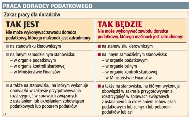 Zakaz na razie w przepisach istnieje, więc sprawdziliśmy, jak postrzegany jest zarówno przez urzędników skarbowych, jak i samych doradców. Według Tomasza Sokolnickiego, dyrektora Izby Skarbowej w Krakowie, zakaz wynikający z art. 33 ustawy o doradztwie podatkowym od strony administracji podatkowej ma swoje uzasadnienie. Ma on m.in. nie dopuszczać do powstania konfliktu interesów, gdyby np. w jednej sprawie po dwóch stronach barykady – od strony urzędu i od strony podatnika – spotkało się małżeństwo. Mogłoby w takiej sytuacji istnieć ryzyko, że sprawa nie jest prowadzona w sposób obiektywny, a jak wiadomo, obiektywizm postępowania podatkowego to jedna z podstawowych zasad, jakich trzeba przestrzegać.