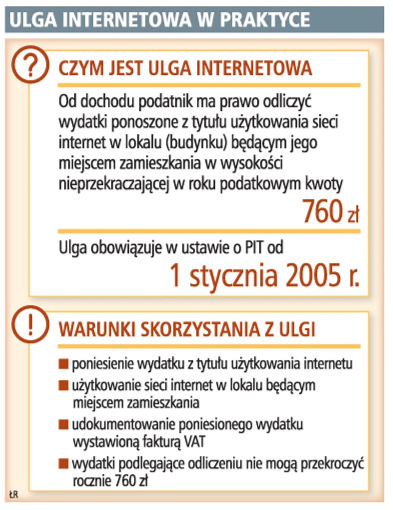 Od 1 stycznia 2005 r. podatnicy mogą odliczać od dochodu wydatki poniesione z tytułu użytkowania internetu w lokalu (budynku) będącym miejscem jego zamieszkania – w wysokości nieprzekraczającej w roku 760 zł. Warunkiem odliczenia jest udokumentowanie poniesionych kosztów fakturą VAT. Aby z ulgi skorzystać, na fakturze musi widnieć opłata za internet.