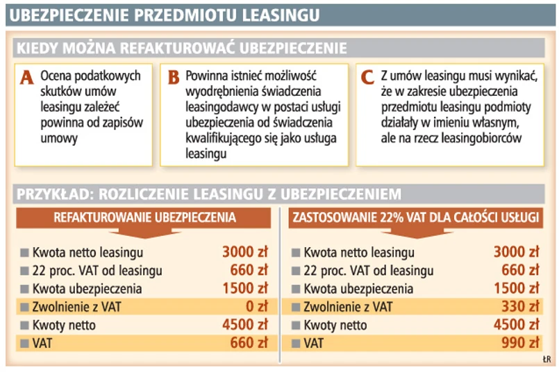 Firmy leasingowe zwykle refakturują na leasingobiorców koszty ubezpieczenia (polis ubezpieczeniowych), stosując zwolnienie z VAT. Postępowanie takie zakwestionowało Ministerstwo Finansów w odpowiedzi na interpelację poselską (nr 8364). Resort tym samym przychylił się do wyroku WSA we Wrocławiu (sygn. akt I SA/ Wr881/08). Sąd uznał, że w przypadku świadczenia usługi leasingu wraz z ubezpieczeniem przedmiotu leasingu mamy do czynienia z jedną usługą, do podstawy opodatkowania której należy zaliczyć również koszty ubezpieczenia przedmiotu leasingu i zastosować jednolitą stawkę podatku.
