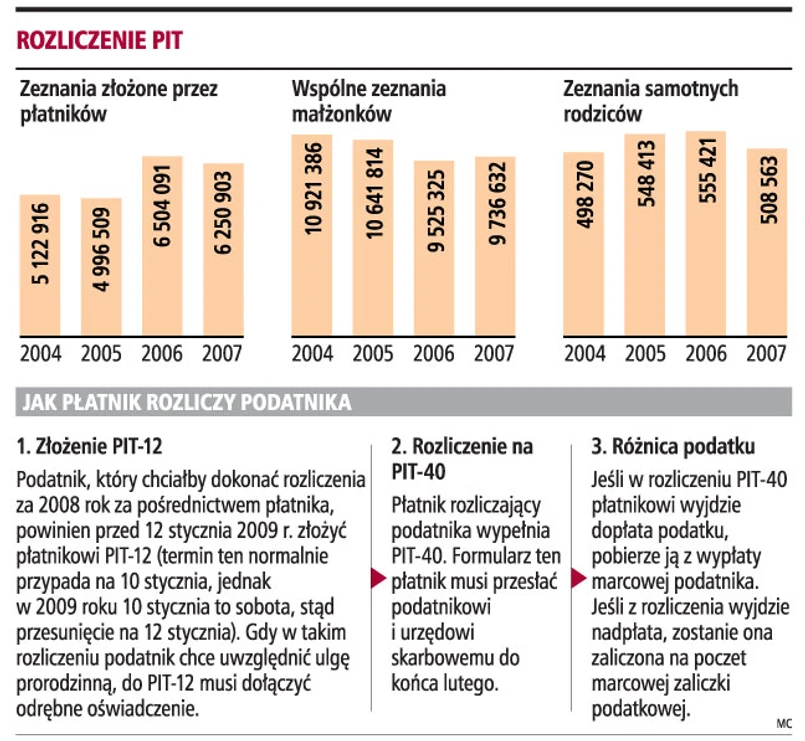 W rozliczeniu za 2007 rok o 211 tys. wzrosła liczba podatników składających małżeński PIT w porównaniu z 2006 rokiem. W konsekwencji zmalała liczba osób składających roczne zeznania podatkowe za pośrednictwem płatników. Zdaniem ekspertów taka tendencja będzie się utrzymywać, bo samodzielne złożenie PIT jest bardziej opłacalne.