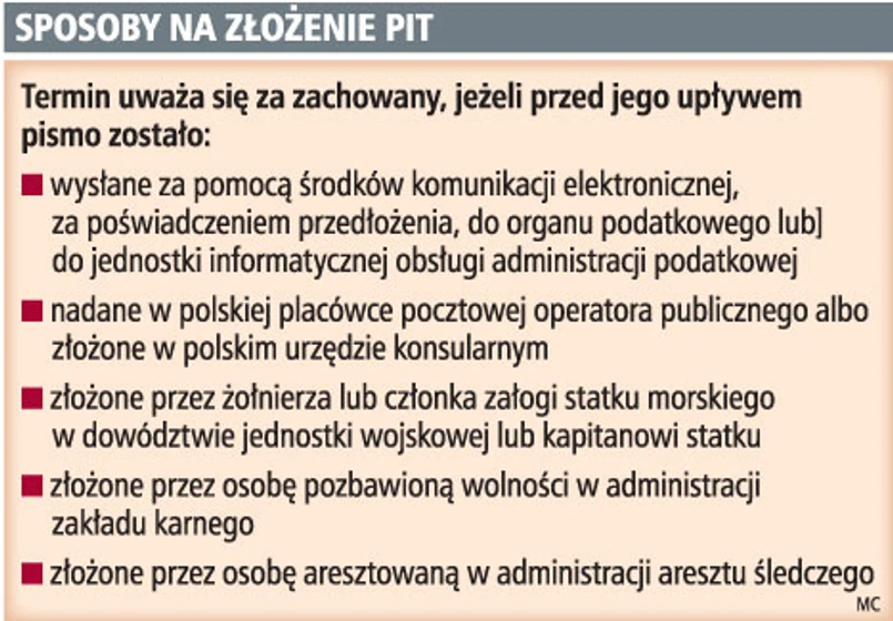 Z ostatniego sondażu PBS DGA, przeprowadzonego na zlecenie GP i Ernst & Young, wynika, że prawie 40 proc. podatników osobiście zanosi swoje zeznanie roczne do urzędu skarbowego. Ta statystyka może dziwić, bo podatnicy mają kilka sposobów na złożenie PIT. Poza osobistą wizytą w urzędzie zeznanie można wysłać pocztą, wrzucić do specjalnej urny bądź urzędomatu, złożyć w placówce konsularnej (gdy podatnik jest za granicą), a także wysłać drogą elektroniczną.