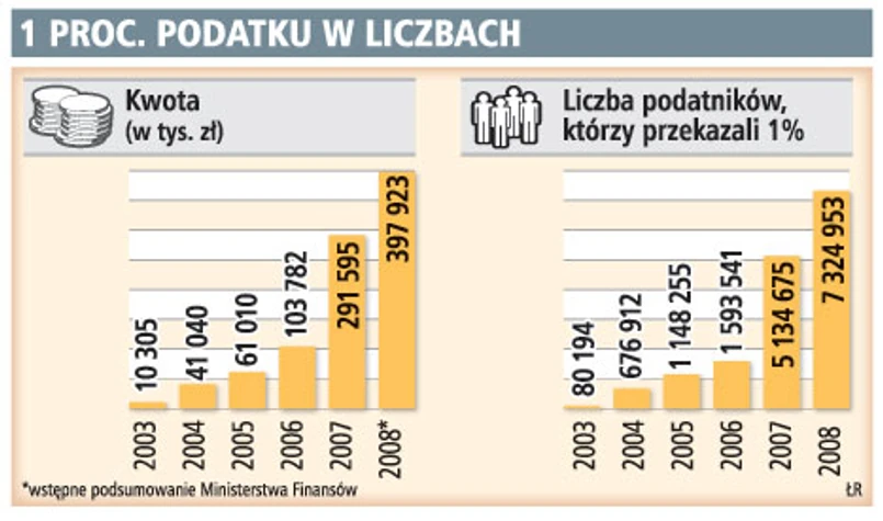Ministerstwo Finansów podsumowało akcję przekazywania 1 proc. podatku na rzecz organizacji pożytku publicznego w rozliczeniu PIT za 2008 rok. Według wstępnych szacunków resortu liczba osób przekazujących 1 proc. zwiększyła się w stosunku do 2007 roku o ponad 2 mln osób. W tym roku 7 324 953 podatników (wszystkich podatników jest około 25 mln) zdecydowało się przekazać 1 proc. podatku na rzecz potrzebujących (w ubiegłym – 5 134 675 osób). Również przekazana kwota osiągnęła rekordowy poziom 397,9 mln zł. W ubiegłym roku było to 271 mln zł.