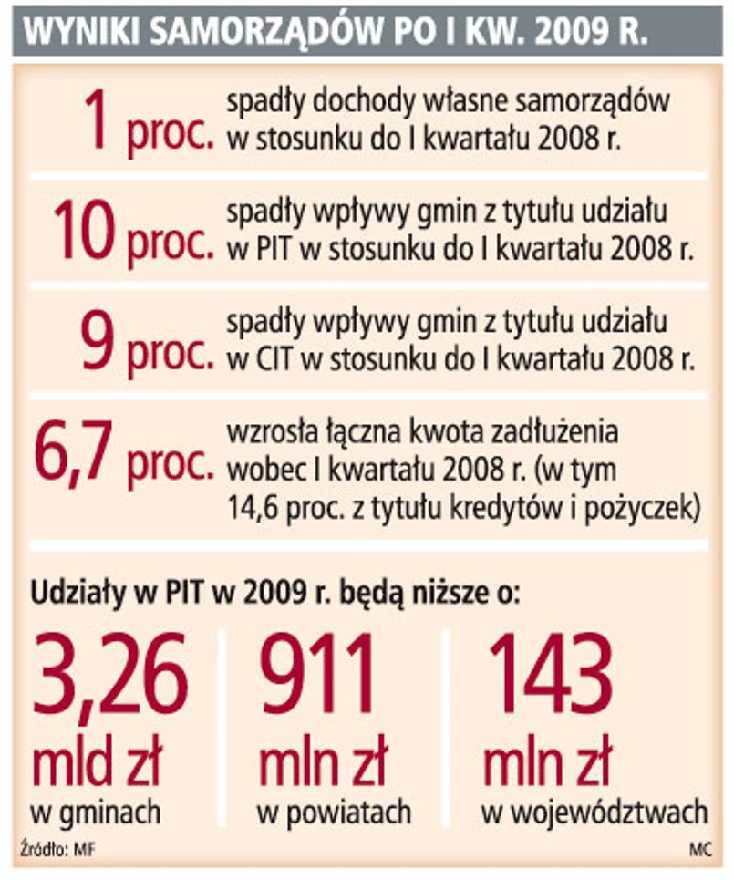 Kryzys dotyka nie tylko finansów państwa, ale również finansów samorządów. Na mniejsze wpływy z budżetu państwa skarżą się miasta i gminy, które otrzymują z tego źródła część podatku dochodowego od osób fizycznych (PIT) oraz podatku dochodowego od osób prawnych (CIT). Już w lutym domagały się od resortu finansów, aby poinformował, o ile mniej środków dostaną na zadania lub w formie dotacji. Resort obiecał przekazać taką informację do końca czerwca, ale zrobił to dopiero teraz. Informacja ta jest niezbędna, aby samorządy mogły zmienić swoje budżety. Jak mówi Andrzej Porawski, dyrektor biura Związku Miast Polskich, dotychczas miasta korygowały swoje budżety na ślepo.