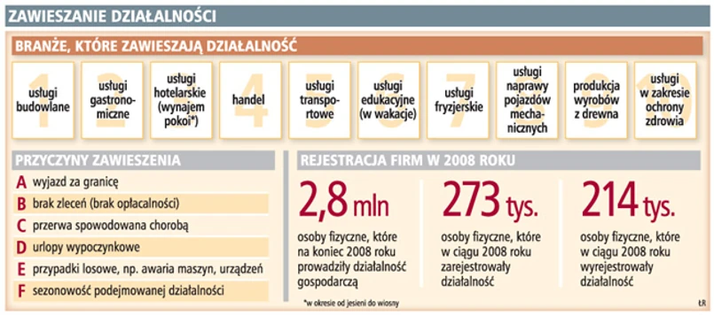 Andrzej Pieczko z Izby Skarbowej w Zielonej Górze dodaje, że zawieszanie działalności występuje częściej w takich branżach, jak np. handel detaliczny, usługi budowlane, usługi taksówek osobowych. Dotyczy oczywiście także działalności o charakterze sezonowym, jak np. prowadzenie pól namiotowych, wypożyczalni sprzętu wodnego, sklepików szkolnych czy udzielania korepetycji.