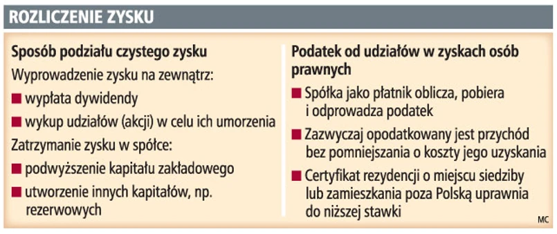 – Jeśli zatem w spółce zysk jest, ale nie ma w danej chwili środków pieniężnych na jego wypłatę, zawsze lepiej przekazać zysk na kapitał zapasowy, a gdy pieniądze już będą, można wypłacić dochód z udziału w zyskach osób prawnych poprzez umorzenie udziałów (akcji) z czystego zysku – wyjaśnia ekspert.
