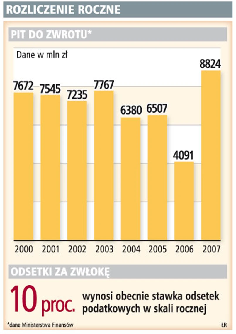 W przypadku gdy organ nie dokona zwrotu w terminie, jest zobowiązany wypłacić podatnikowi nie tylko nadpłacony podatek, ale również odsetki za zwłokę, których wysokość jest równa odsetkom od zaległości podatkowych. Dominika Dragan-Berestecka podkreśla, że w takiej sytuacji odsetki są naliczane od dnia złożenia zeznania rocznego (względnie korekty zeznania) aż do dnia zwrotu podatku. Stawka odsetek od zaległości podatkowych wynosi obecnie 10 proc. w skali rocznej.