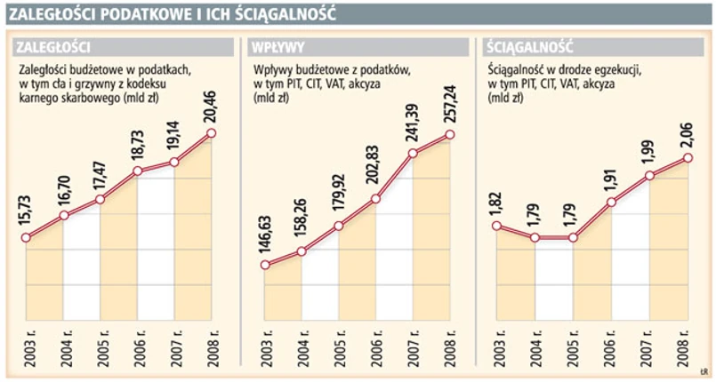 Zaległości z tytułu nieściągniętych podatków w 2008 roku wyniosły ponad 20 mld zł. W drodze egzekucji odzyskano ok. 10 proc. zaległych kwot, czyli nieco ponad 2 mld zł. Poprawa ściągalności długów zwiększy wpływy do budżetu państwa.