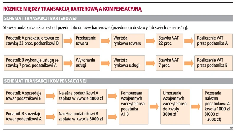 Umowa barterowa może rodzić w praktyce więcej komplikacji podatkowych niż umowa kompensacyjna. Zdaniem Janiny Fornalik, doradcy podatkowego w MDDP Michalik Dłuska Dziedzic i Partnerzy, przy barterach wynagrodzenie za wykonane świadczenie jest określone w naturze (zamiana usługi na towar, usługi na usługę, towaru na towar). Natomiast w umowie kompensacyjnej strony w sposób tradycyjny określają wysokość wynagrodzenia, a jedynie sposób jego uregulowania przyjmuje formę kompensaty wzajemnych należności i zobowiązań. W obu przypadkach strony - o ile są podatnikami VAT - muszą wystawić faktury VAT.
