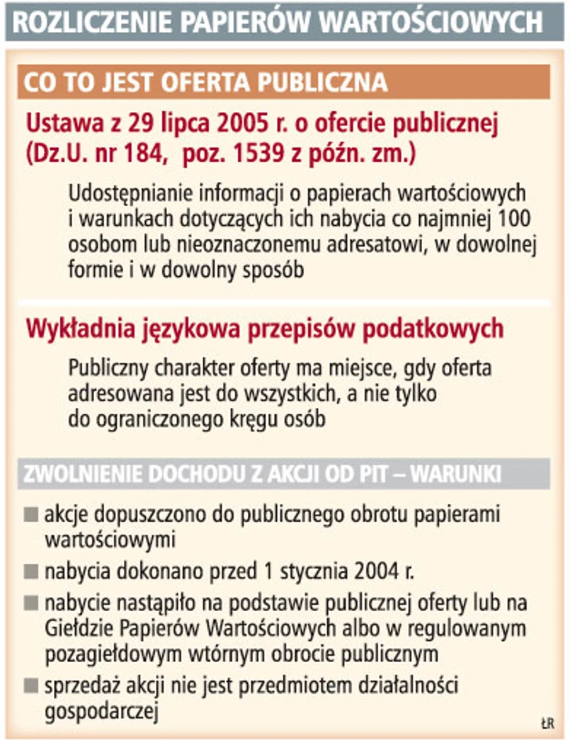 Marek Kozaczuk, radca prawny w kancelarii Dewey & LeBoeuf, jest zdania, że do akcji nabytych przed 31 grudnia 2003 r. nie można stosować definicji oferty publicznej wprowadzonej ustawą z 2005 roku. Skoro zwolnienie z PIT dotyczy dochodów z odpłatnego zbycia akcji nabytych przed 1 stycznia 2004 r. na podstawie publicznej oferty, to dla zdefiniowania pojęcia publicznej oferty, w ramach której nastąpiło nabycie akcji, właściwy jest stan prawny obowiązujący 31 grudnia 2003 r.