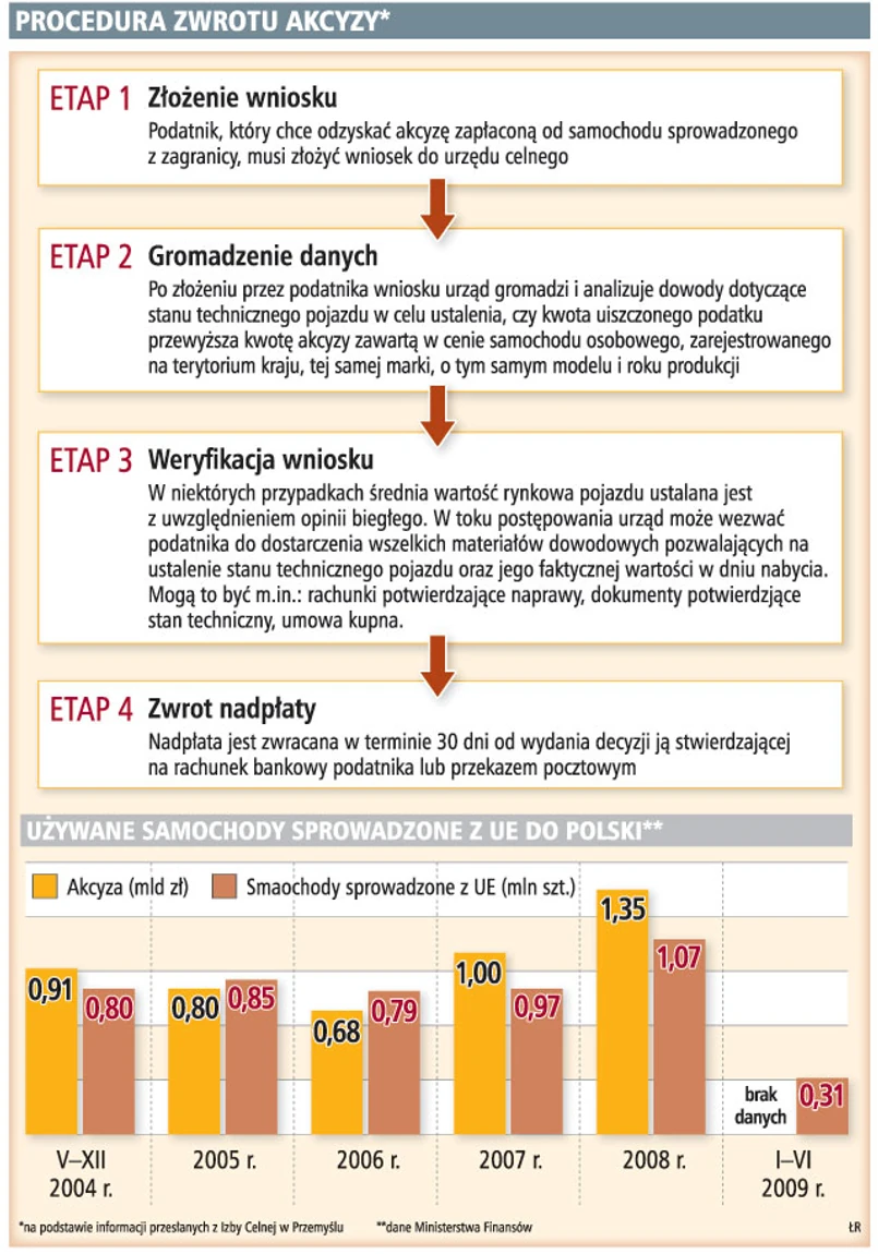 Według Wiesławy Dróżdż z Izby Celnej w Kielcach po złożeniu wniosku o zwrot akcyzy urząd prowadzi postępowanie, w ramach którego dokonywane jest porównanie zapłaconego podatku akcyzowego według stawek obowiązujących w dniu złożenia deklaracji w stosunku do krajowej kwoty podatku obliczonej według stawki 3,1 lub 13,6 proc. od podobnych samochodów oferowanych do sprzedaży na terytorium kraju.