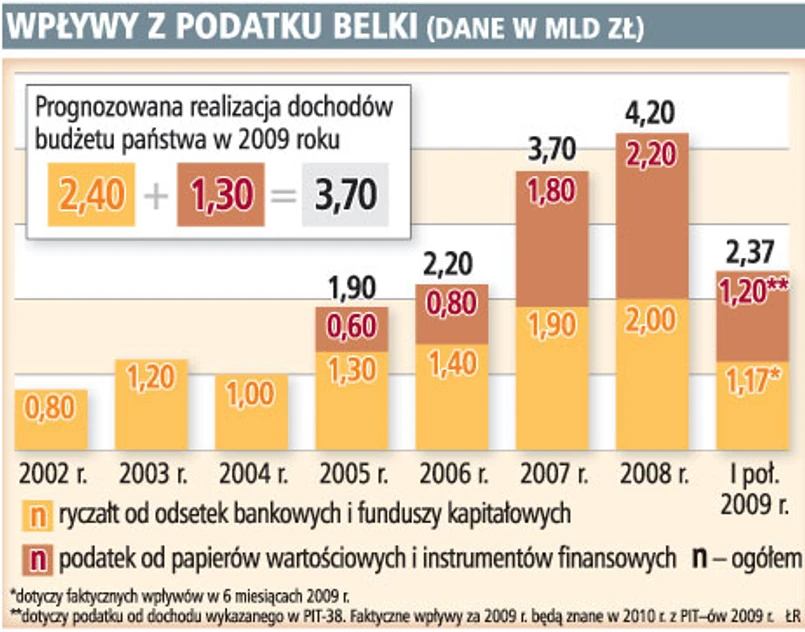 Spowolnienie gospodarcze skłoniło resort finansów do weryfikacji wcześniej zakładanych planów dotyczących wpływów z tzw. podatku Belki. Obecnie, według prognoz MF, prawdopodobna realizacja dochodów budżetu w 2009 roku w zakresie podatku ryczałtowego od przychodów z odsetek bankowych i od dochodów z tytułu udziału w funduszach kapitałowych wyniesie ok. 2,4 mld zł. Wcześniej 2,9 mld zł. Podatek z odpłatnego zbycia instrumentów finansowych ma wynieść ok. 1,3 mld zł, co oznacza, że prognoza została podtrzymana.