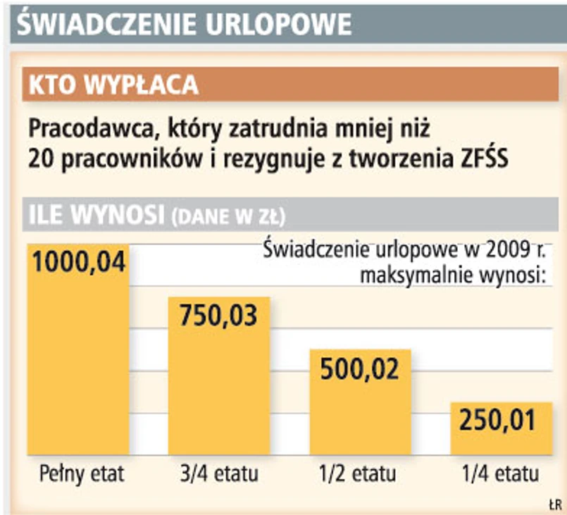 Świadczenie urlopowe i tzw. wczasy pod gruszą od 22 sierpnia są w różnie opodatkowane. W wyniku nowelizacji ustawy o PIT z 17 lipca 2009 r. wczasy pod gruszą jako świadczenie finansowane z zakładowego funduszu świadczeń socjalnych (ZFŚS) zwolnione są z PIT do 380 zł rocznie. Natomiast świadczenie urlopowe wypłacane przez pracodawców, którzy zatrudniają mniej niż 20 pracowników i rezygnują z tworzenia ZFŚS jest w całości opodatkowane. Wypłata z ZFŚS, aby była zwolniona z PIT, powinna mieć charakter pomocy materialnej kierowanej do pracowników, którzy samodzielnie nie byliby w stanie sfinansować sobie wypoczynku. Świadczenie urlopowe zależy natomiast od wymiaru pracy i nie jest uzależniane od sytuacji pracownika. Pracodawcy powinni zatem zweryfikować swoją politykę w zakresie zasad dofinansowania.