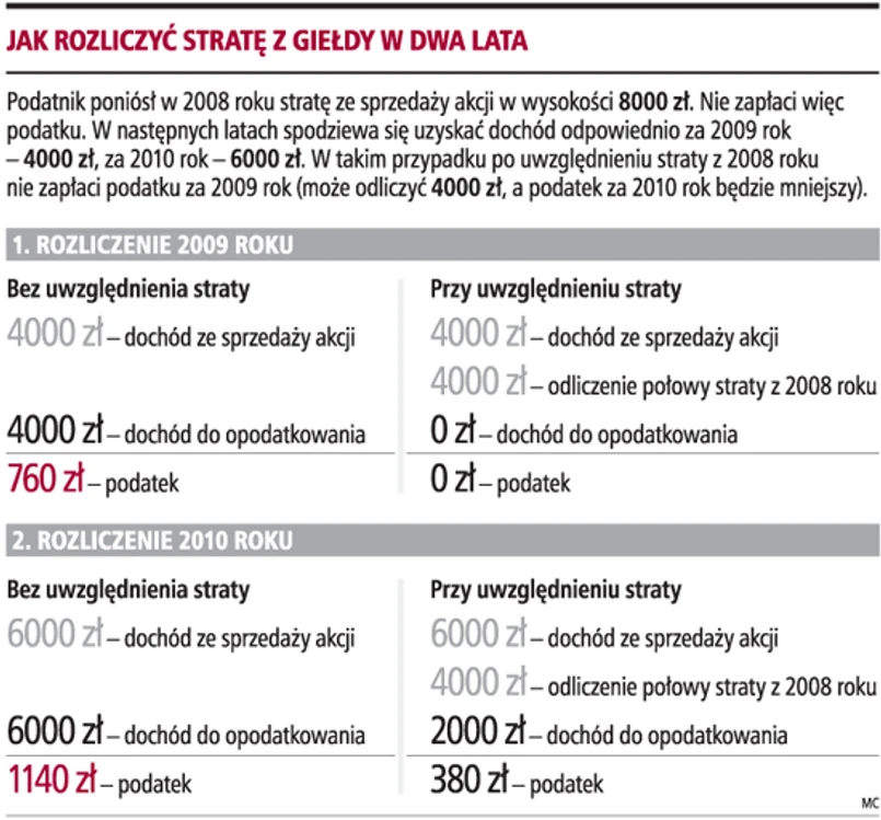 Szymon Czerwiński, konsultant w Accreo Taxand, dodaje, że strata poniesiona na giełdzie może być odliczona przez podatników w ciągu kolejnych pięciu lat, jednak wysokość odliczenia w którymkolwiek z tych lat nie może przekroczyć 50 proc. tej straty. Rzecz jasna, aby rozliczyć stratę, należy w kolejnych latach podatkowych wykazać dochód do opodatkowania.