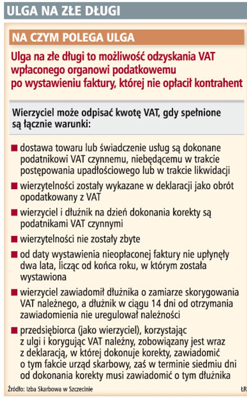 Przedsiębiorcy coraz chętniej korzystają z ulgi na złe długi. Pozwala ona odzyskać wpłacony VAT od urzędu skarbowego po wystawieniu faktury, która nie została uregulowana przez kontrahenta. W niektórych województwach wzrost zainteresowania tym rozwiązaniem jest spory. Przykładem może być woj. mazowieckie. W 2008 roku z ulgi w VAT skorzystało 16 podatników. A w I półroczu 2009 r. już 240. Takie wnioski płyną z sondy GP przeprowadzonej w izbach skarbowych.