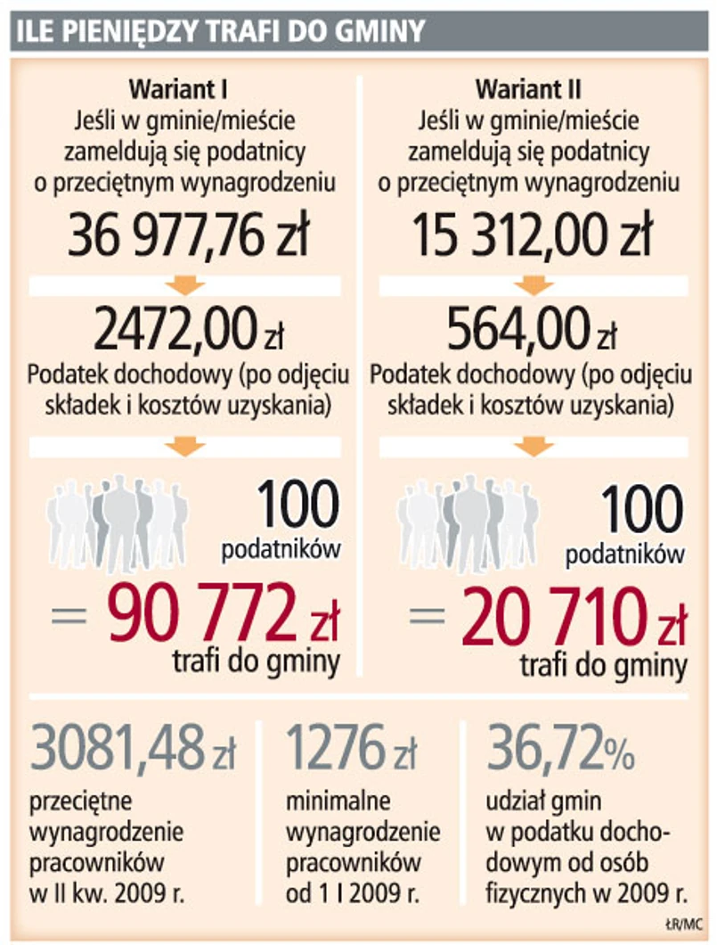 Ostatnio Warszawa za to, że mieszkający na terenie miasta podatnicy odprowadzą podatek w warszawskich urzędach skarbowych, proponuje dodatkowe ułatwienia. Jak mówi nam Tomasz Andryszczyk, rzecznik stołecznego ratusza, miasto analizuje możliwość wprowadzenia od nowego roku systemu przywilejów w postaci m.in. pierwszeństwa w zapisach do żłobków i przedszkoli oraz zniżek na korzystanie z ich, zniżek w teatrach miejskich czy obiektach sportowych. Przywileje te miałyby obejmować zarówno osoby, które podjęły decyzję o przeniesieniu podatków do stolicy, jak i warszawiaków, którzy od lat płacą tu podatki. Jest się o co bić. Miasto ocenia, że co roku traci kilkaset milionów złotych dochodów, za które można by zbudować drogi i mosty.