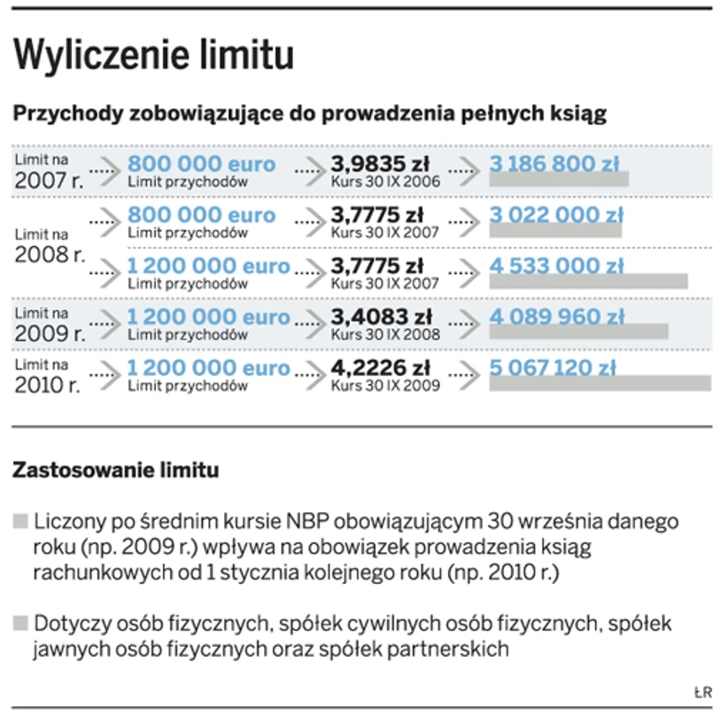 W przyszłym roku wiele spółek będzie mogło zrezygnować z prowadzenia pełnej księgowości. Wynika to z faktu, że obowiązek prowadzenia ksiąg rachunkowych w 2010 roku będą miały te spółki, których przychody netto w tym roku przekroczą 5 067 120 zł. Tak wysoki limit jest konsekwencją znacznego wzrostu kursu euro i zeszłorocznego podwyższenia limitu przychodów zobowiązującego do otwarcia ksiąg z 800 tys. do 1,2 mln euro.
