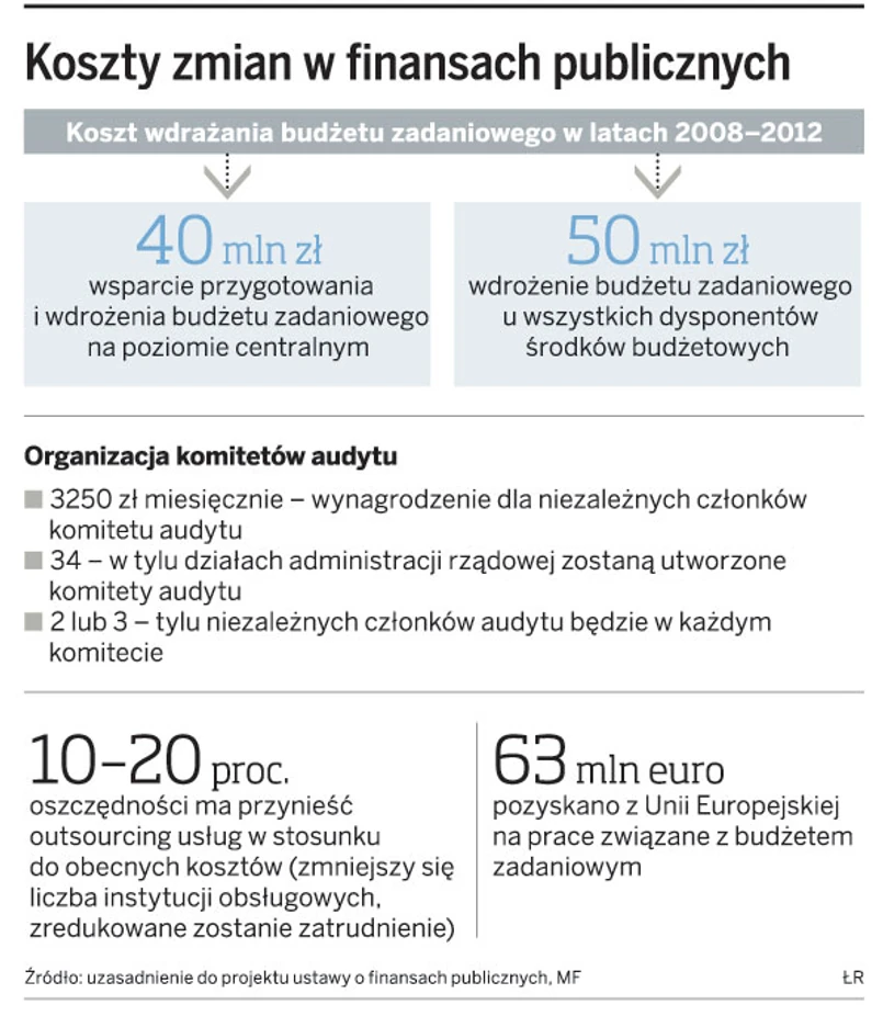 Ministerstwo Finansów, które przygotowało nową ustawę o finansach publicznych, nie określiło szczegółowych kosztów zmian. W uzasadnieniu resort podał szacunkowy koszt powołania członków nowych komitetów audytu, których powstanie przewiduje ustawa. Wydatki trzeba będzie ponieść także w związku z faktem przejęcia przez ministra skarbu akcji i obligacji posiadanych przez jednostki (z wyjątkiem samorządów). Resort stwierdził też, że neutralne będzie tworzenie nowych wieloletnich prognoz finansowych w samorządach i wieloletniego planu finansowego państwa. Inne koszty można jednak przewidzieć. Jak mówi dr Michał Bitner z Uniwersytetu Warszawskiego, nie można mówić o kosztach w sensie przepływów pieniężnych, ponieważ ustawa nie wpływa na pozycje dochodów i wydatków budże-towych.