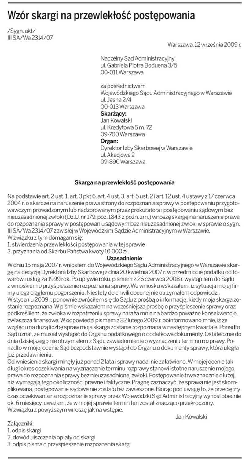 Podatnik, który uważa, że jego sprawa zbyt długo była załatwiana przez sąd administracyjny, może złożyć skargę na przewlekłość postępowania. Powinna być wniesiona przed prawomocnym zakończeniem postępowania. Złożona po tym czasie zostanie odrzucona.