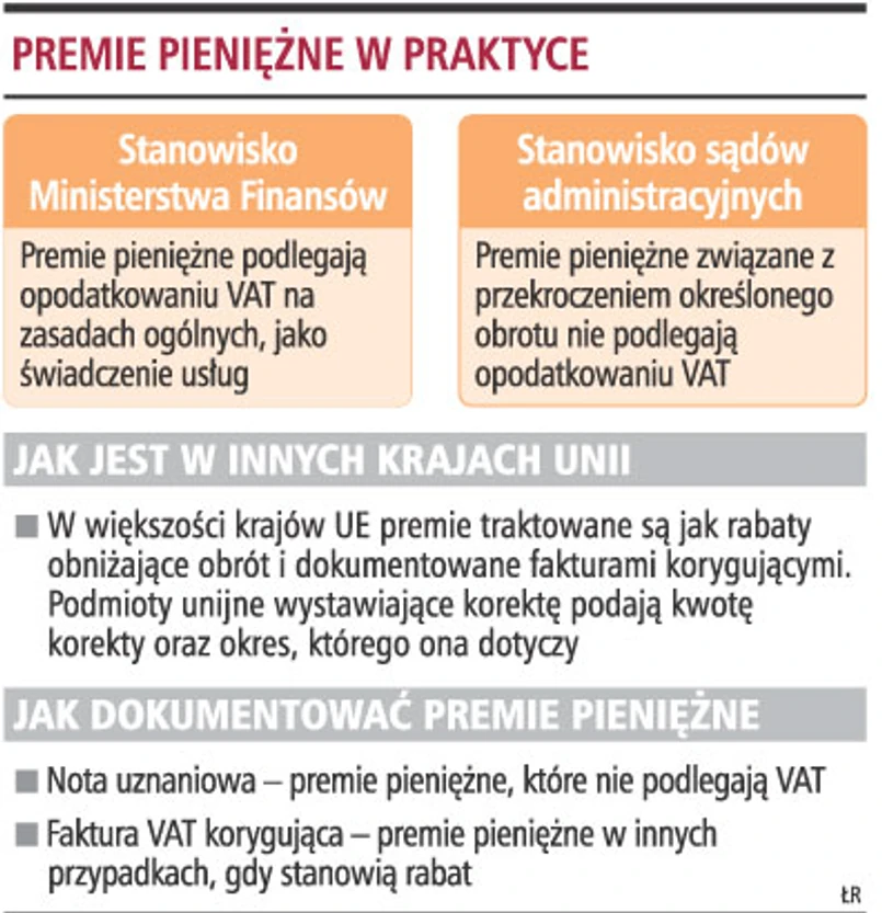 Dodaje, że właściwie jedyną pozytywną zmianą jest to, że od czasu scentralizowania interpretacji podatkowych w resorcie finansów odpowiedzi na indywidualne zapytania podatników są już zbieżne - wskazują zawsze, że jeśli premia pieniężna nie ma charakteru rabatu, wówczas powinna być traktowana jako zapłata za usługi i udokumentowana fakturą VAT.