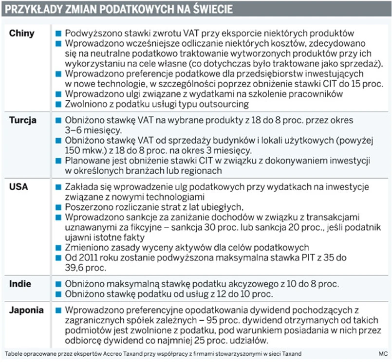 Chiny, Japonię oraz państwa należące do Unii Europejskiej. Jak podkreśla Michał Roszkowski, starszy konsultant w Accreo Taxand, z jednej strony badaniu podlegały zmiany wprowadzone w przepisach podatkowych w związku z kryzysem gospodarczym, nakierowane na zahamowanie spadku koniunktury i pobudzenie wzrostu gospodarczego. Z drugiej zaś – mające na celu zwiększenie wpływów budżetowych lub uszczelnienie systemu podatkowego.