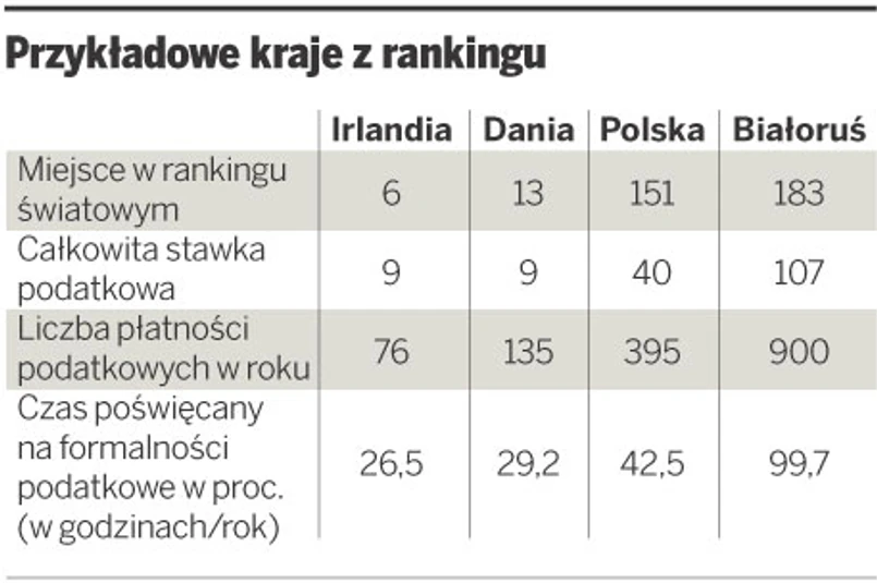 Według ekspertów winić za ten wynik należy wskaźniki administracyjne dotyczące liczby godzin spędzanych na wypełnianiu formalności podatkowych oraz liczby płatności dokonywanych w ciągu roku.