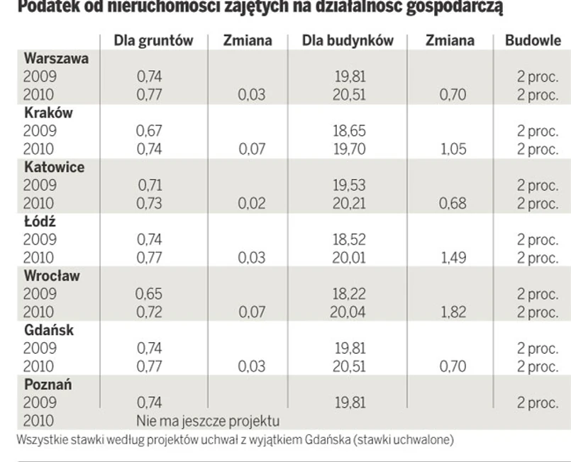 Miasta odczuwają skutki kryzysu, co powoduje, że coraz więcej z nich decyduje się na ustalenie na 2010 rok stawek maksymalnych podatku od nieruchomości. Najwyższe stawki podatku od gruntów i budynków zajętych na prowadzenie działalności gospodarczej będą obowiązywały w Warszawie, Gdańsku i zapewne w Poznaniu. Najbardziej wzrost obciążeń podatkowych odczują natomiast przedsiębiorcy posiadający budynki lub ich części zajęte na prowadzenie działalności we Wrocławiu. Będą oni musieli zapłacić podatek według stawki wyższej od obowiązującej w 2009 roku, aż o 1,82 zł za 1 mkw. powierzchni budynku.