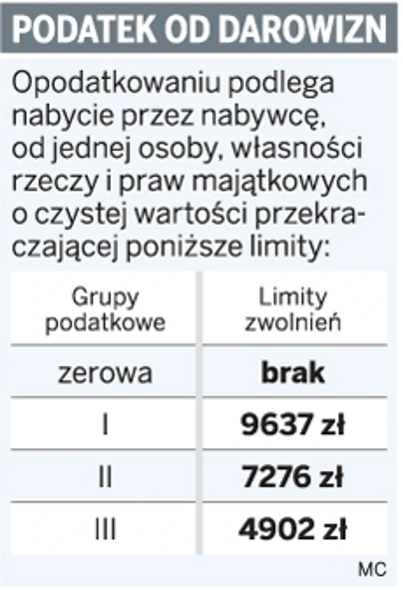 Małgorzata Gorzkowska, prawnik z Auxilium, tłumaczy, że na podstawie art. 4a ustawy o podatku od spadków i darowizn (t.j. Dz.U. z 2009 r. nr 93, poz. 768) zwolniono od podatku nabycie własności rzeczy lub praw majątkowych przez małżonka, zstępnych, wstępnych, pasierba, rodzeństwo, ojczyma i macochę (tzw. zerowa grupa podatkowa). Otrzymujący darowiznę od najbliższych korzystają ze zwolnienia od podatku.