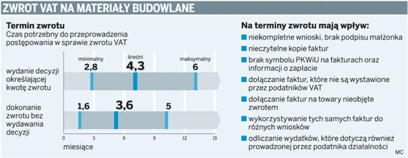 Na przełomie roku do urzędów skarbowych wpływa najwięcej wniosków o zwrot części VAT na materiały budowlane, przysługujący osobom fizycznym ponoszącym wydatki mieszkaniowe. Złożenie wniosku wszczyna postępowanie w sprawie zwrotu, co oznacza, że wniosek oraz wszystkie składane z nim dokumenty, w szczególności kopie faktur, podlegają obowiązkowej weryfikacji. Podatnicy często mają problemy z właściwym wypełnieniem wniosku (VZM-1). Konieczność wyjaśnienia nieprawidłowości wydłuża czas oczekiwania na zwrot, który może wynosić nawet pół roku. Błędy te wymienia również Rada Ministrów w swojej negatywnej opinii do projektu ustawy skracającego terminy zwrotu do 60 dni.