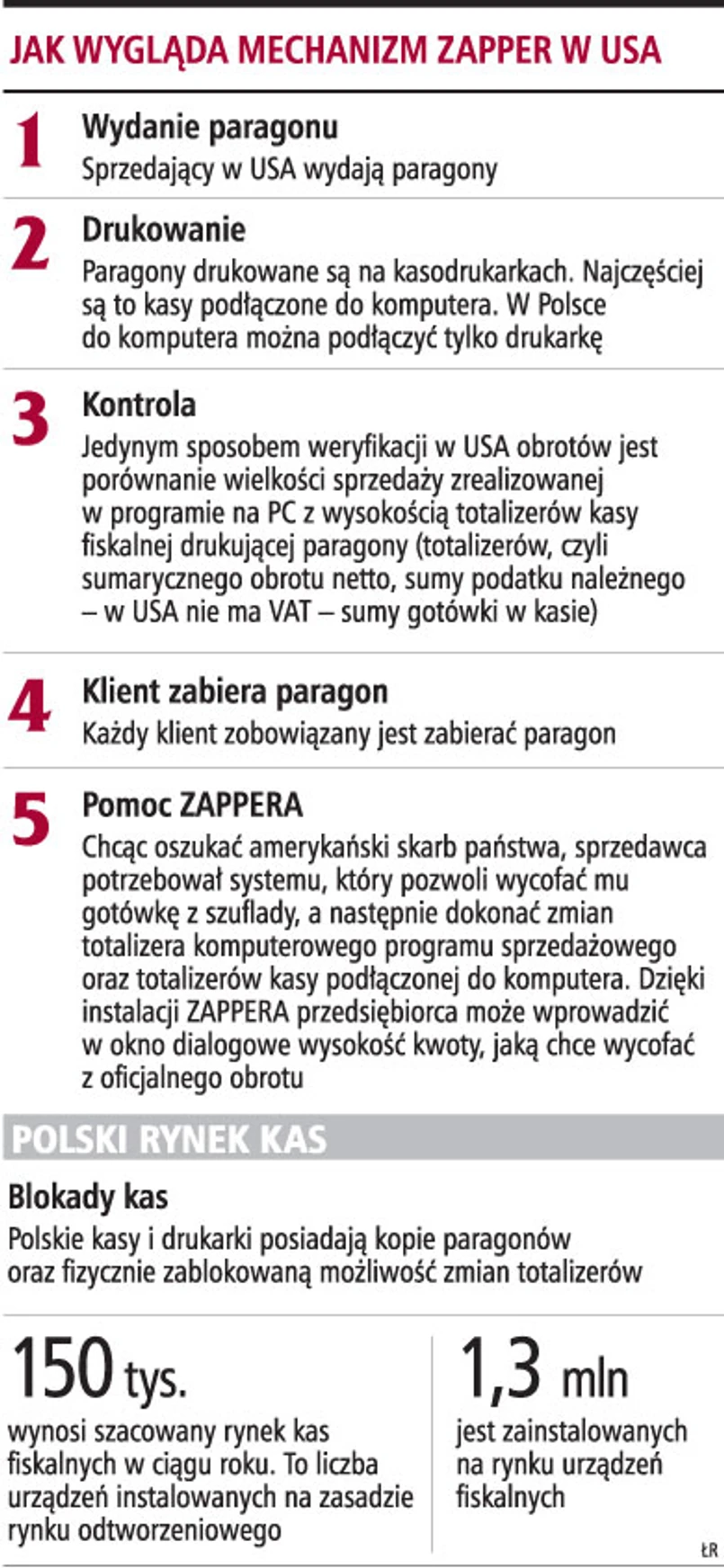 Nowojorscy restauratorzy oszukali fiskusa na 20 mln dol. dzięki programowi ZAPPER. W Polsce instalacja takich programów jest niemożliwa, kasy zabezpieczone są banderolą i plombą. Jakakolwiek ingerencja w kasę byłaby wykryta przez serwis lub fiskusa, co grozi wysoką karą.