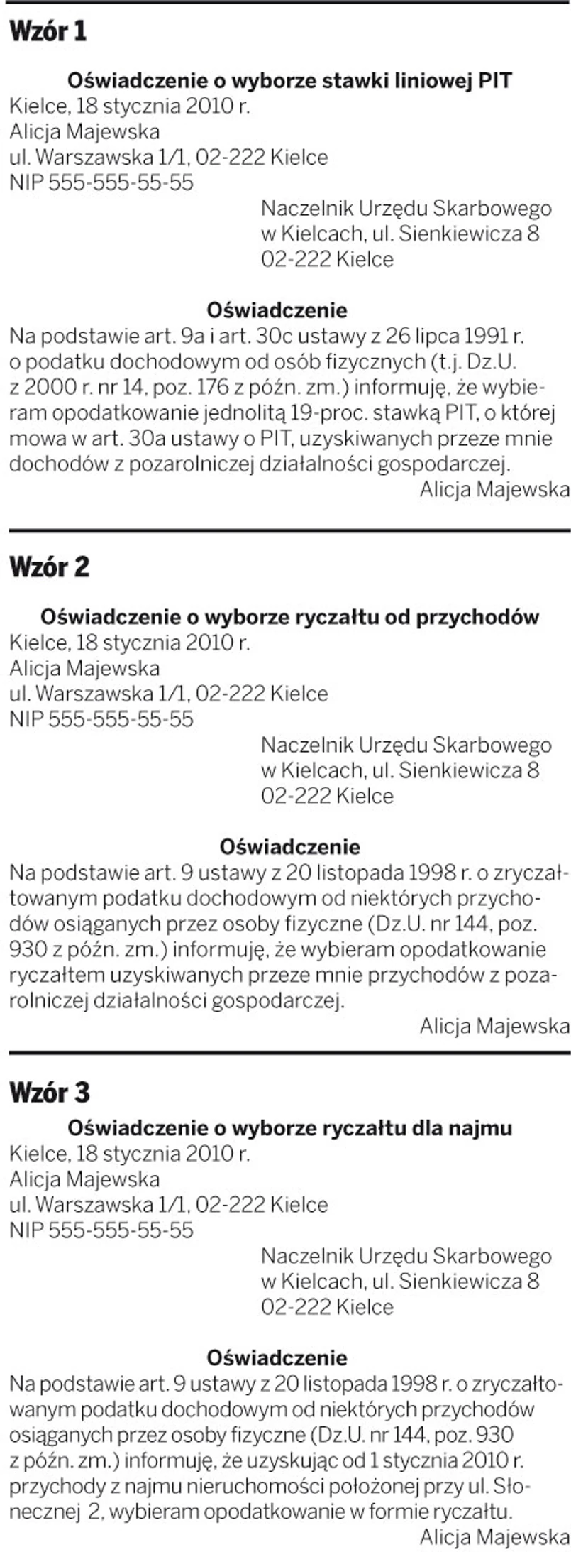 Zaledwie trzy dni zostały na wybór formy opodatkowania, który będziemy stosować w 2010 roku. Najpóźniej 20 stycznia trzeba zawiadomić o tym naczelnika urzędu skarbowego. To ważna wiadomość dla każdego, kto rozpoczął prowadzenie działalności gospodarczej albo zaczął zajmować się wynajmem. Również podatnicy, którzy chcą zmienić sposób opodatkowania, np. z zasad ogólnych na ryczałt od przychodów ewidencjonowanych, mają czas na zmiany do 20 stycznia 2010 r. Decydując się na jedną z form: zasady ogólne, czyli skala PIT, liniowy 19-proc. PIT, formy zryczałtowane, czyli ryczałt od przychodów ewidencjonowanych lub karta podatkowa, trzeba dobrze przeanalizować, która z nich będzie dla nas najbardziej opłacalna. Przy niektórych rodzajach działalności wybór pewnych form, np. karty podatkowej, nie będzie możliwy.
