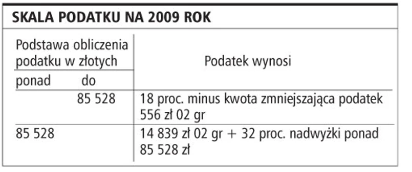 Mimo że do końca roku zostały jeszcze trzy miesiące, już dziś łatwo można wyliczyć, jakie podatki będziemy płacić w 2009 roku. Najważniejsza zmian to oczywiście zastąpienie starej trzystopniowej skali PIT ze stawkami 19, 30 i 40 proc., nową z dwiema obniżonymi stawkami: 18 i 32 proc. z wysokim progiem przejścia między nimi, który został ustalony na poziomie 85 528 zł. Nie zmieni się natomiast kwota dla której podatek wynosi zero (tzw. kwota wolna). W 2009 roku podobnie jak dziś będzie ona wynosiła 3091 zł. To skutek przyjęcia w nowej skali niższej kwoty zmniejszającej podatek w pierwszym przedziale dochodowym. Z tego samego powodu w przyszłym roku niższa będzie ulga na dzieci (ulga prorodzinna). Wyniesie ona 1112,04 zł na każde dziecko. Dziś jest to 1173,70 zł.
