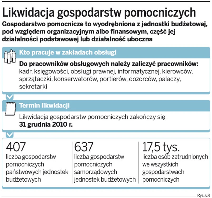 Państwowe jednostki budżetowe rozpoczęły już likwidację swoich gospodarstw pomocniczych, np. zakładów obsługi przy urzędach wojewódzkich. W rezultacie likwidacji niektórzy pracownicy dostaną odprawy i zostaną zwolnieni. Pracownicy mieli jednak nadzieję, że likwidowane gospodarstwa pomocnicze państwowych jednostek budżetowych zostaną przekształcone w instytucje gospodarki budżetowej. Rząd od kilku miesięcy zwleka jednak z wydaniem rozporządzenia określającego tryb i sposób tych przekształceń. Bez rozporządzenia przekształcenia gospodarstw w instytucje są bardzo trudne.