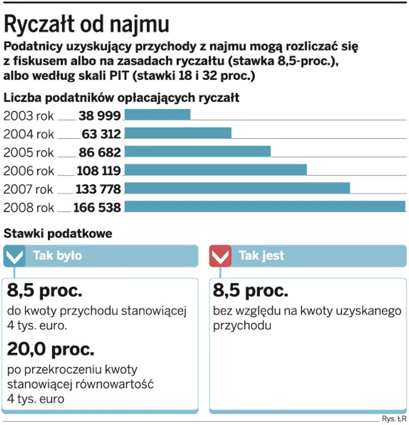 Nie tylko więcej osób zgłosiło chęć opłacania ryczałtu od przychodów z najmu w tym roku. Również więcej podatników zdecydowało się na zmianę formy opodatkowania – z zasad ogólnych na ryczałt. Małgorzata Brzoza z Izby Skarbowej w Szczecinie podaje, że dochody z najmu według skali podatkowej (zeznanie PIT-36) opłacało w 2007 roku 5909 podatników, w 2008 roku – 5877, a w 2009 roku tylko 263.