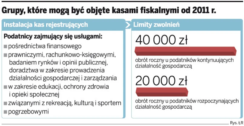 Tymczasem Ministerstwo Finansów chce zakończyć w kwietniu prace nad przepisami rozszerzającymi na nowe grupy podatników obowiązek stosowania w prowadzonej działalności gospodarczej kas fiskalnych. Zgodnie z wcześniejszymi zapowiedziami MF oraz Planem Rozwoju i Konsolidacji Finansów 2010–2011 nowym obowiązkiem ma zostać objęte jak najszersze grono przedsiębiorców. Ważne przy tym będzie to, aby resort finansów przy rozbudowywaniu tych przepisów nie poszedł za daleko. Nie ma przecież potrzeby wprowadzania kas fiskalnych u podatników, którzy każdą transakcję dokumentują fakturami VAT. Przykładem mogą być zakłady wodociągowe.