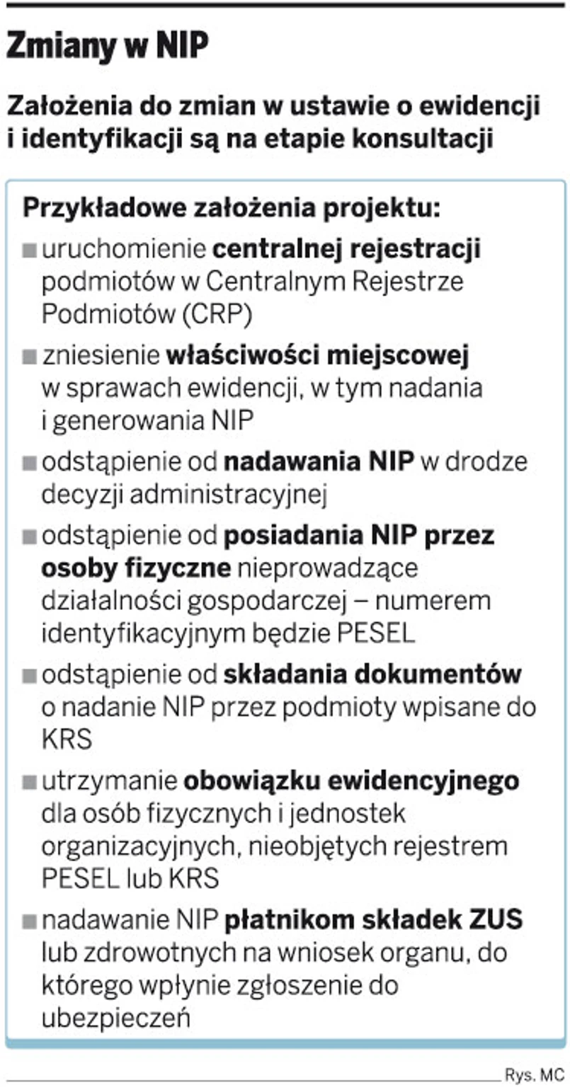Osoby fizyczne, które nie prowadzą działalności gospodarczej, nie będą musiały ubiegać się o nadanie numeru identyfikacji podatkowej (NIP). W kontaktach z fiskusem będą posługiwały się numerem PESEL. Z kolei NIP dla firm nie będzie już nadawany w formie decyzji administracyjnej. To tylko część zmian, które znalazły się we wstępnych założeniach do nowelizacji ustawy o ewidencji i identyfikacji podatników i płatników. Jak dowiedział się DGP, założenia są właśnie na etapie konsultacji.