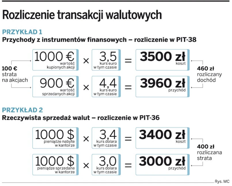 Papiery wartościowe nominowane w walutach obcych generują przychód w złotych. Opodatkowaniu PIT podlega też spekulacja rzeczywistymi walutami. Podatek płaci się od zysku walutowego, ale podatnik może odliczyć stratę.