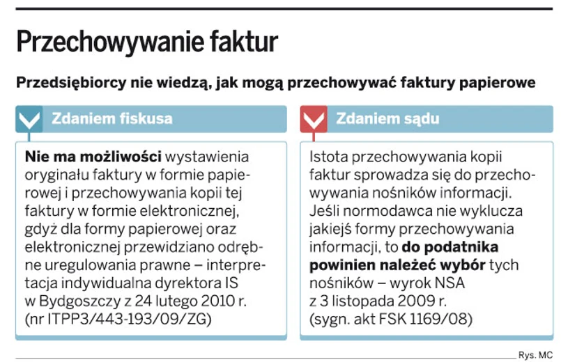 Podatnik, który otrzymuje faktury papierowe, może wybrać sposób ich przechowywania – w wersji drukowanej czy elektronicznej – uznał NSA. Innego zdania są organy podatkowe. Przykładowo dyrektor Izby Skarbowej w Bydgoszczy twierdzi, że nie ma możliwości wystawienia oryginału faktury w formie papierowej i przechowywania jej kopii w formie elektronicznej.