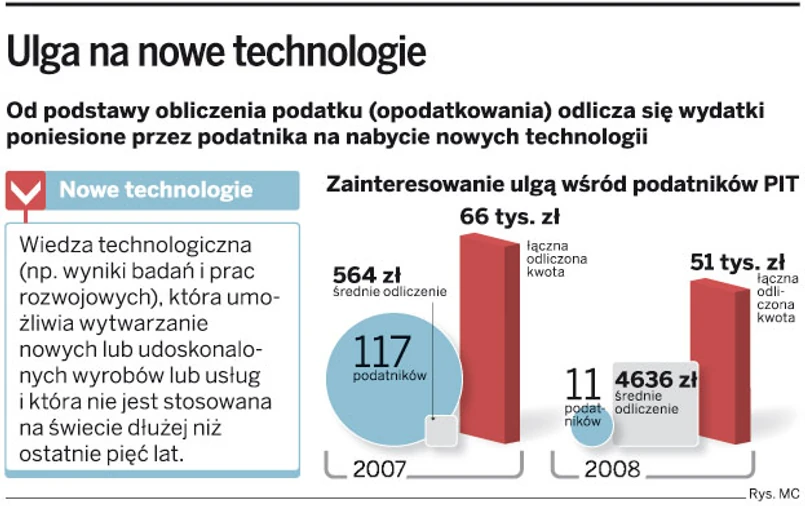 Od czterech lat przedsiębiorcy mogą korzystać ze specjalnej ulgi na nowe technologie. Polega ona na odliczeniu od dochodu wydatków poniesionych m.in. na wiedzę technologiczną w szczególności wyniki badań i prac rozwojowych. Niestety niewielu podatników jest zainteresowanych tym odliczeniem. W 2007 roku skorzystało z niej 117 przedsiębiorców PIT, a w 2008 roku 11.