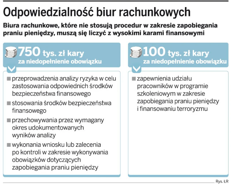 Biura rachunkowe, które nie stosują procedur w zakresie zapobiegania praniu pieniędzy i finansowania terroryzmu, muszą się liczyć w wysokimi karami finansowymi. Przypomnijmy, że na dostosowanie procedur wewnętrznych do nowych zadań w tym zakresie przedsiębiorcy ci mieli czas do 22 kwietnia.
