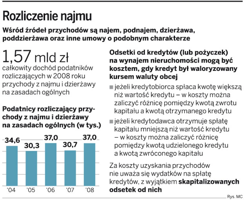 Jednym ze źródeł przychodów zgodnie z ustawą o PIT (t.j. Dz.U. z 2010 r. nr 51, poz. 307 z późn. zm.) jest najem. Ta sama ustawa – jak podkreśla Agata Szymborska-Sutton, analityk Tax Care – stanowi, że koszty poniesione w celu osiągnięcia przychodów są kosztami uzyskania przychodów. Wyjątkiem są koszty wymienione w art. 23 ustawy o PIT. W artykule tym, a dokładnie w ust. 1 pkt 8 lit. a) zapisano, że nie uważa się za koszty wydatków na spłatę kredytów z wyjątkiem skapitalizowanych odsetek od tych kredytów, pod warunkiem że są to odsetki naliczone i już zapłacone.