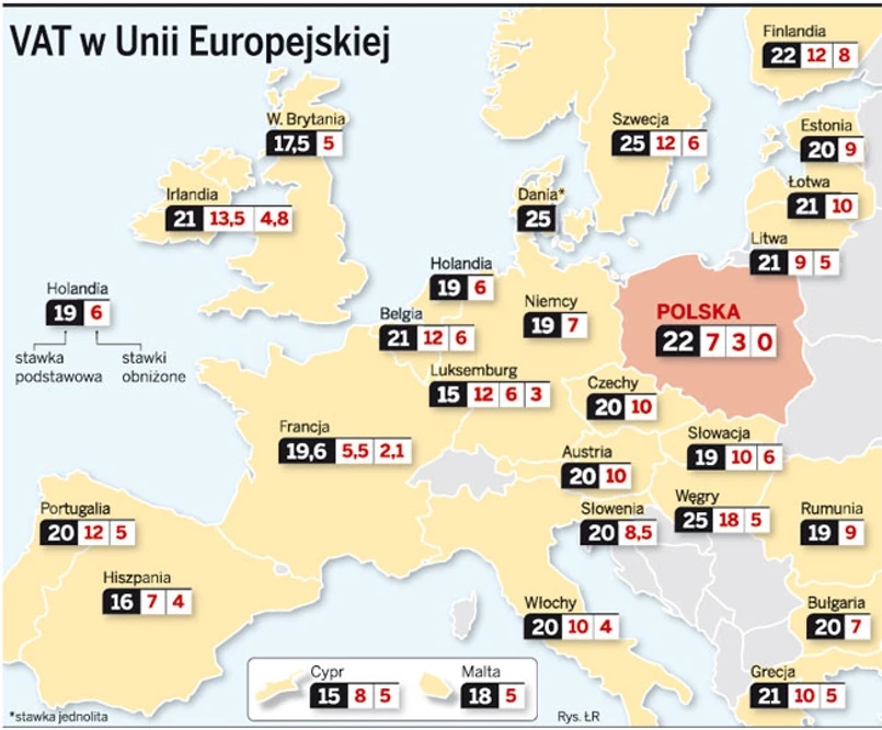 W Polsce standardowa 22-proc. stawka VAT na tle innych państw UE jest dość wysoka. Jerzy Martini, doradca podatkowy w Baker & McKenzie, zauważa, że co prawda są kraje o ekstremalnym poziomie opodatkowania (Dania, Szwecja, a od zeszłego roku też Węgry), gdzie stawka podstawowa VAT wynosi 25 proc., ale średnia unijna oscyluje w okolicach 20 proc. Od pewnego czasu można zaobserwować trend wzrostowy, jeśli chodzi o wysokość stawek VAT w UE.