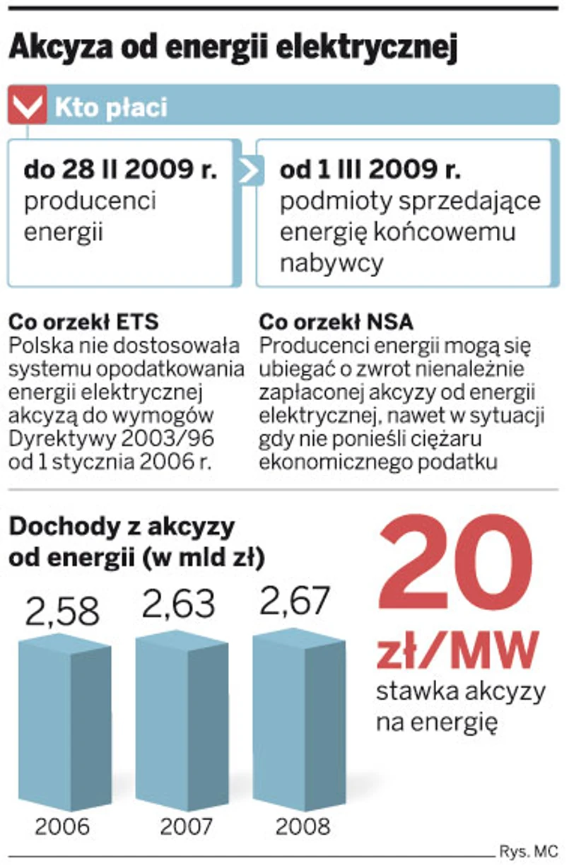 Przypomnijmy, że resort finansów chciał zwrócić producentom energii elektrycznej tylko część akcyzy, którą płacili od 1 stycznia 2006 r. do 28 lutego 2009 r. od energii. Zwrot miał dotyczyć tylko tej części podatku, która była uiszczana od strat powstałych przy przesyłaniu energii. Resort oszacował, że dla poszczególnych lat, tj. 2006, 2007, 2008, 2009, straty przesyłowe nie przekroczyły 10 proc. W konsekwencji MF musiałoby oddać podatnikom niecały 1 mld zł akcyzy wraz z odsetkami zamiast szacowanych przez specjalistów 10 mld zł z tytułu całej nadpłaty podatku.