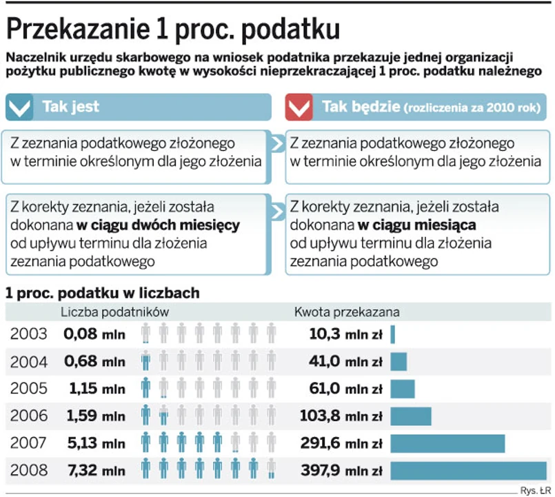 Nowe zasady w zakresie przekazywania 1 proc. podatku dla OPP wejdą w życie 1 stycznia 2011 r., ale będą miały zastosowanie już do rozliczenia za 2010 rok. Joanna Aleksiejczuk wyjaśnia, że w rozliczeniu za rok 2010 skróceniu ulegnie termin na złożenie korekty zeznania. Podatnik będzie mógł skorzystać z możliwości przekazania 1 proc. podatku z korekty, jeśli zostanie ona dokonana w ciągu miesiąca od upływu terminu przewidzianego na rozliczenie się z fiskusem.