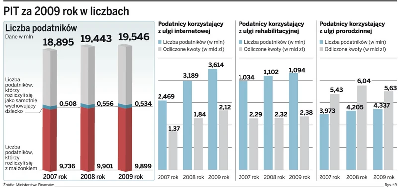 Łączna kwota odliczeń od podatku wyniosła w deklaracjach za 2009 rok 5,8 mld zł (w 2008 roku 6,3 mld zł). To zapewne skutek mniejszych kwot odliczanych z tytułu ulgi prorodzinnej. Odliczenia od dochodu wyniosły 5,4 mld zł (w 2008 roku 5,2 mld zł). Do tego wzrostu z kolei mogła przyczynić się większa liczba osób, które skorzystały z ulgi internetowej.