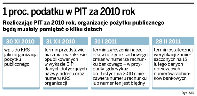 Organizacje pożytku publicznego (OPP), które będą chciały otrzymać 1 proc. z PIT za 2010 rok, będą musiały się o to postarać bardziej niż dotychczas. Chodzi przede wszystkim o zapamiętanie kilku dat do wypełnienia pewnych obowiązków, aby fiskus mógł przekazać pieniądze pochodzące od podatników. Takie zmiany przewiduje nowelizacja ustawy o działalności pożytku publicznego i o wolontariacie oraz niektórych innych ustaw, która wejdzie w życie 1 września.